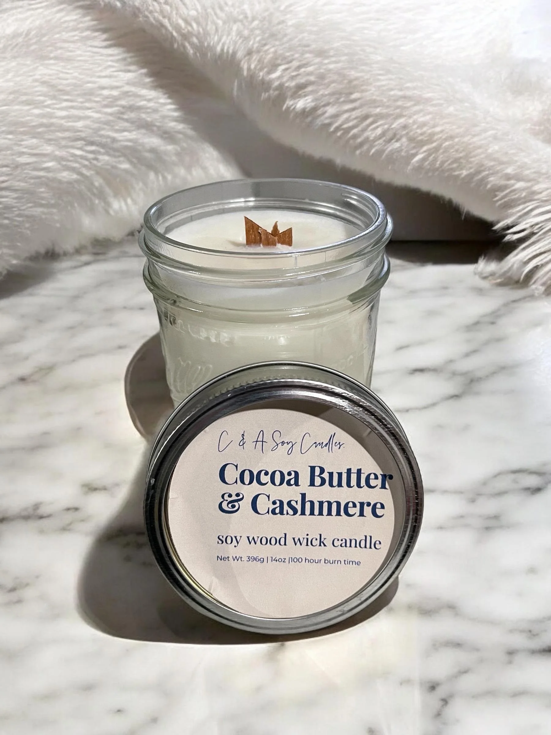 The Cocoa Butter Cashmere candle is a relaxing mix of sweet cocoa butter and coconut. Elegant under notes of cedarwood, jasmine, and rich vanilla complete this unique, lovely blend. Perfect for any occasion. The wooden wick also crackles or whispers which adds to a cozy ambiance.